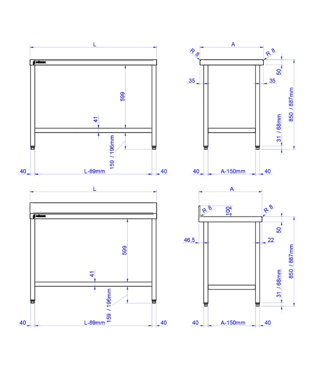 Fornecido com ômegas de reforço longitudinal na parte inferior da bancada e chassi que garante excelente estabilidade ao trabalhar sobre a mesa. Bancada com frente de 50 mm e bordas arredondadas.