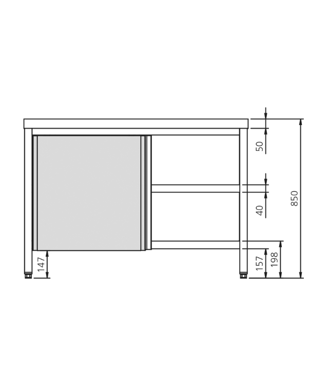 Pernas em tubo de 40 x 40 mm, reguláveis em altura.