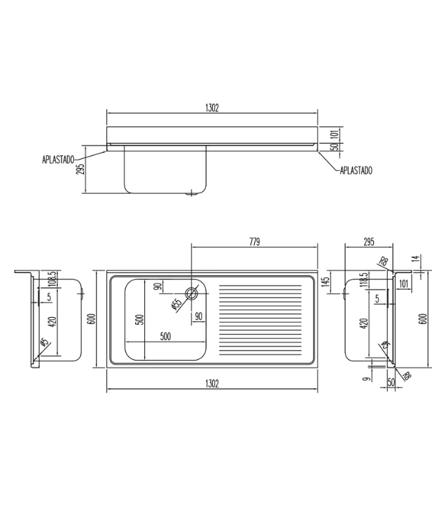 Bancadas de 600 mm de profundidade com pia totalmente soldada e backsplash de 100 mm de altura.