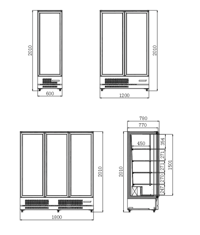 - 4 linhas de prateleiras maciças reforçadas com 500 mm de largura, em chapa pintada de preto (prateleiras extras disponíveis). São fornecidas 4 prateleiras por porta como padrão. Estas prateleiras são projetadas para apresentação de bebidas e alimentos, ideais para supermercados e lojas de conveniência.